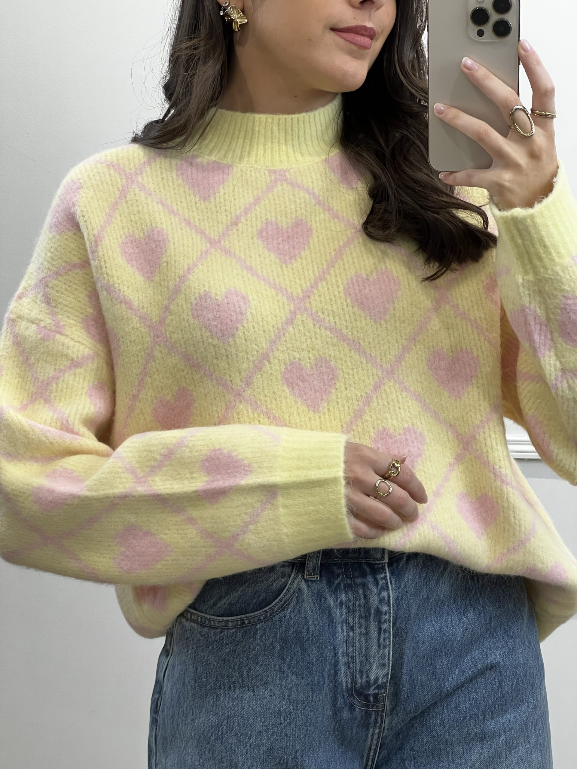 PULL JACQUARD JAUNE COEURS ROSES